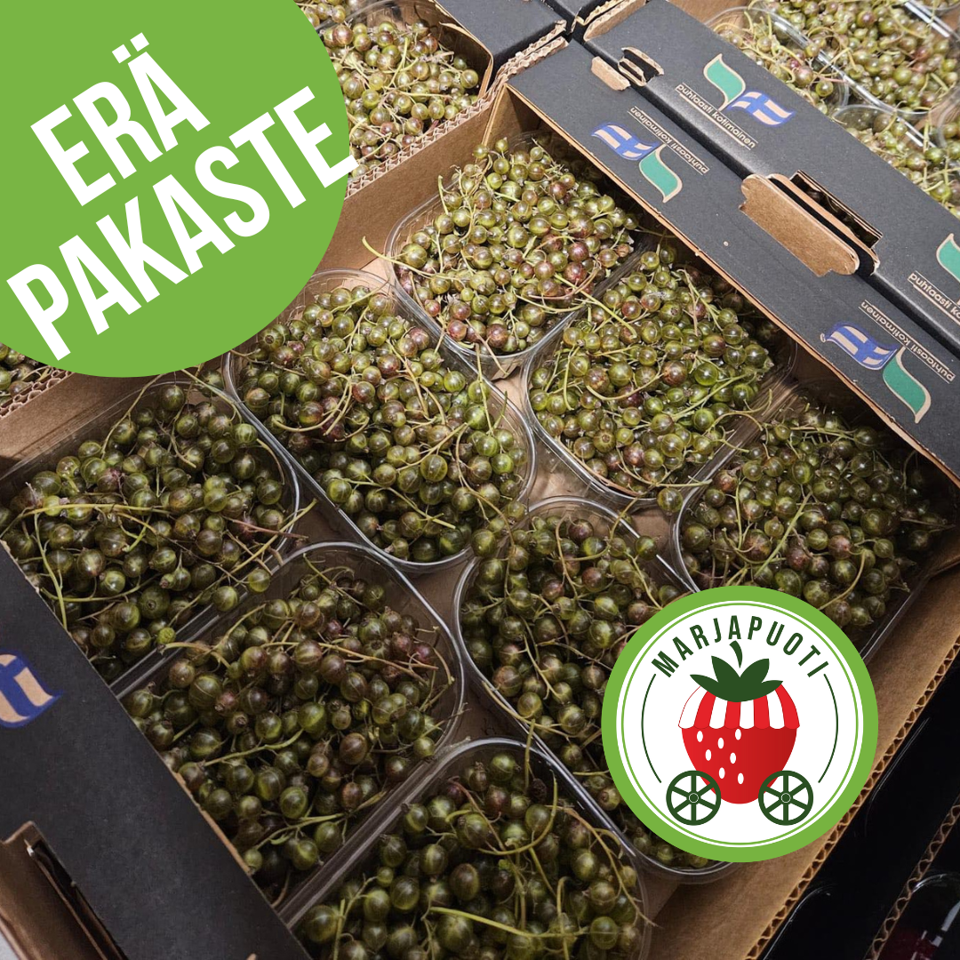 Suomalainen I-luokan luomuviherherukka pakasteena. Viherherukassa on vähän ruotuja mukana. Marjat poimitaan käsipoimurilla, joten kaikki marjat eivät ole mm. kypsyydeltään samanlaisia (joukossa voi olla jokunen raaempi).